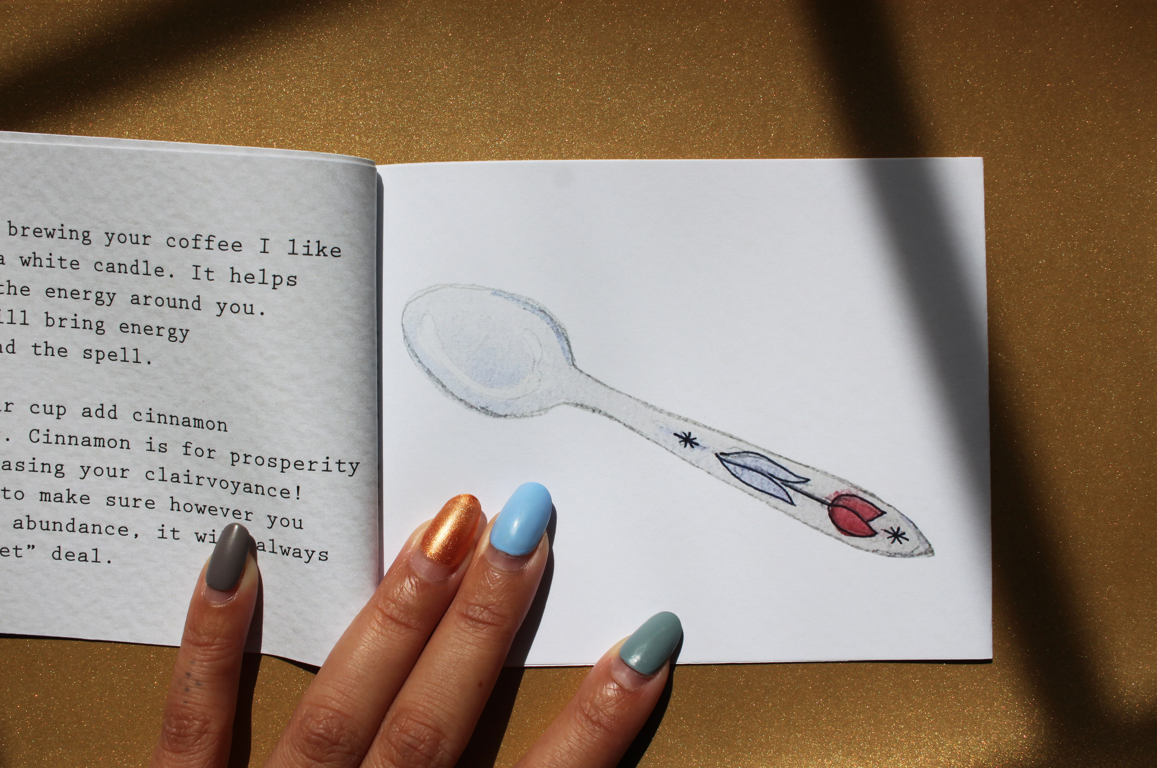 A zine on how to make enchanted coffee. This is my favorite zine because I used a sewing machine to bind it.