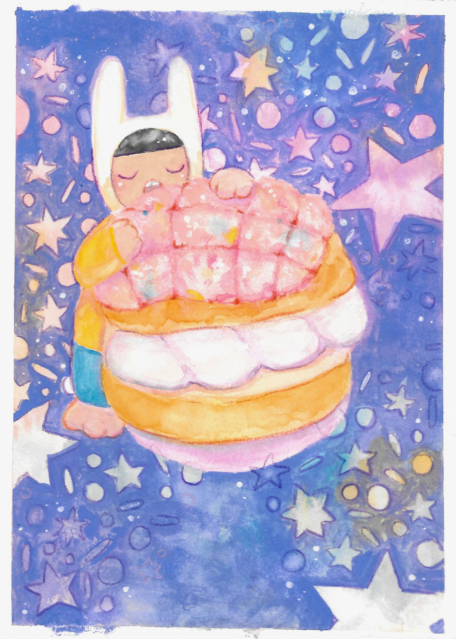 Puffy is an evolving character in the Moonsang Universe. They represent the different phases of my life. For this particular painting, I was inspired by the Strawberry Melon Pan at Mochiko Cafe located in Cincinnati, Ohio.